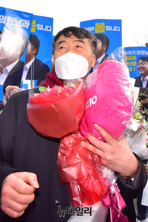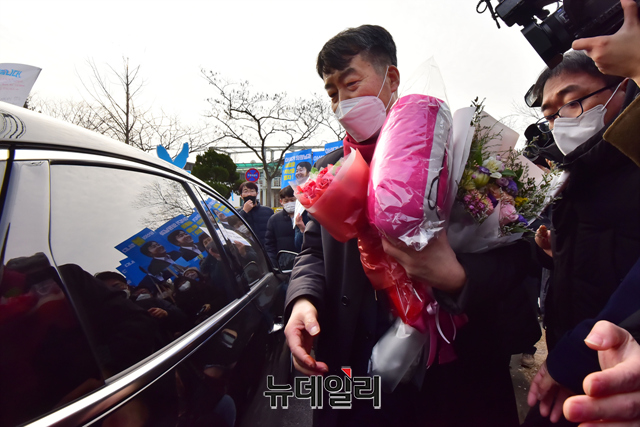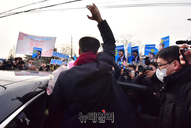 내란 선동죄 등의 혐의로 징역 9년을 선고 받은 이석기 전 통합진보당 의원이 24일 오전 대전구치소 앞에서 가석방 출소를 마치고 지지자들에게 인사를 하고 있다.