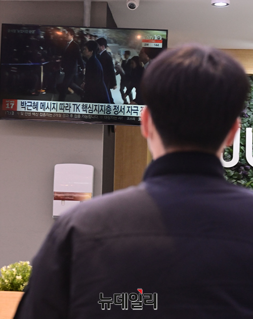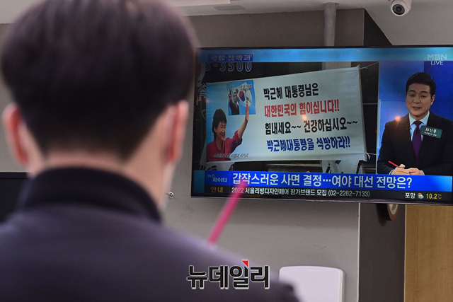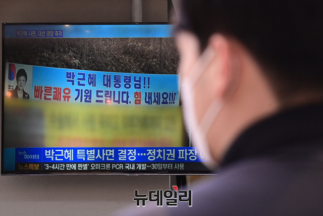 박근혜 전 대통령의 특별사면이 확정된 24일 오후 경기지역의 한 고속도로 휴게소에서 고객들이 관련 뉴스를 시청하고 있다. 정부는 31일자로 전직 대통령 등 3,094명에 대한 '2022년 신년 특별사면'을 단행한다고 밝혔다. 이명박 전 대통령은 특별사면에서 제외됐다. (경기=강민석 기자)