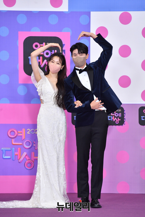방송인 이은혜, 노지훈이 25일 오후 서울 여의도 KBS에서 온라인으로 열린 '2021 KBS 연예대상' 레드카펫에서 포즈를 취하고 있다.