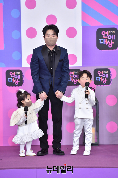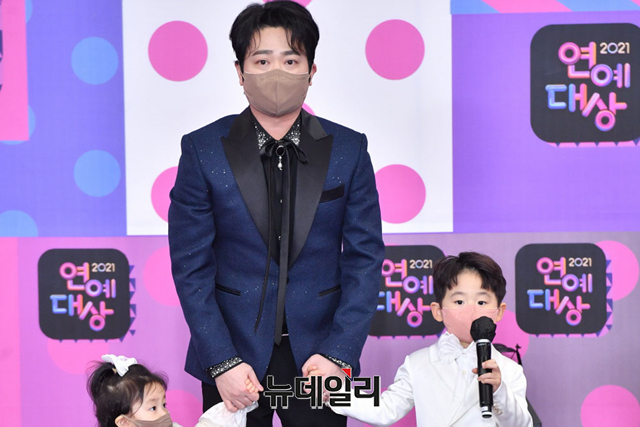 가수 박현빈, 아들 박하준, 딸 박하연이 25일 오후 서울 여의도 KBS에서 온라인으로 열린 '2021 KBS 연예대상' 레드카펫에서 포즈를 취하고 있다.