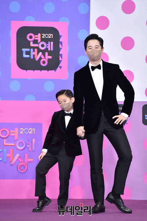배우 김재원, 아들 김이준이 25일 오후 서울 여의도 KBS에서 온라인으로 열린 '2021 KBS 연예대상' 레드카펫에서 포즈를 취하고 있다.
