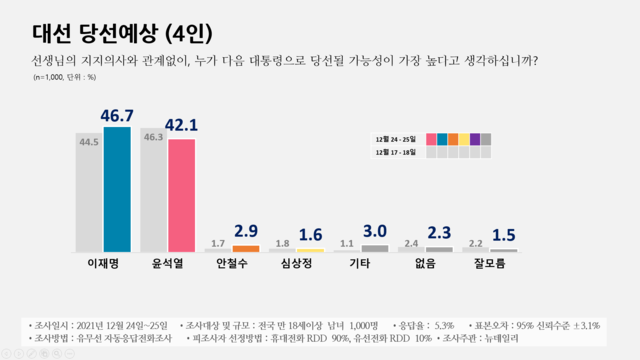 尹. 40대, 70대 제외한 나머지 연령층서 지지율 하락연령별로는 60대 이상을 제외한 전 계층에서 이 후보가 높았다. △만 18세~20대 윤석열 32.1%, 이재명 36.5% △30대 윤석열 33.2%, 이재명 41.7% △40대 윤석열 31.5%, 이재명 50.4% △50대 윤석열 42.1%, 이재명 46.9% △60대 윤석열 56.9%, 이재명 35.1% △70대 이상 윤석열 54.6%, 이재명 27.0% 등으로 조사됐다.윤 후보는 지난 조사 대비 만 18세~20대(6.6%p), 30대(12.3%p), , 50대(1.3%p), 60대(4.7%p) 등에서 지지율이 떨어졌다. 반면 40대(-1.6%p)와 70대 이상(-4.5%p)에서는 지지율이 상승했다.이 후보는 만 18세~20대(4.1%p), 30대(2.4%p), 50대(0.6%p), 60대(9.1%p) 등에서 지지율이 올랐다. 반면 40대(-8.8%p)와 70대 이상(11.8%p)에선 떨어졌다.'당선 예상' 윤석열 42.1%, 이재명 46.7%당선 예상과 관련해서는 윤 후보는 42.1%, 이 후보는 46.7%로 일주일 새 판세가 뒤집힌 것으로 조사됐다. 윤 후보는 전주 대비 4.2%p 떨어졌고, 이 후보는 같은 기간 2.2% 올랐다. 심 후보는 1.6%(0.2p%↓), 안 후보 2.9%(2.2p%↑)였다. '지지하는 후보 없음'은 2.3%(0.1%p↓), '기타' 3.0%(1.9%p↑), '잘 모름' 1.5%(0.7%p↓)였다.지지후보 교체 의향을 묻는 질문에는 76.7%가 '계속 지지하겠다'고 했고, 20.0%는 '바꿀수도 있다'고 답했다. '잘 모르겠다'는 응답은 3.4%였다.더불어민주당 지지자 중 83.9%는 현재 자신이 택한 후보를 계속 지지하겠다고 했고, 14.9%는 후보를 바꿀 수도 있다고 했다. 국민의힘 지지자의 경우 82.1%는 '계속 지지', 14.8%는 '바꿀수도 있다'고 했다. 정의당은 각각 62.9%와 29.6%, 국민의당은 각각 82.8%와 15.0%로 집계됐다.지지후보에 대해선… 76.7% '계속 지지', 20.0% '바꿀수도'이 후보가 당선될 것이라고 예상한 이들 중 계속 지지하겠다는 응답은 75.7%, 바꿀 수도 있다는 응답은 22.5%였다. 윤 후보의 경우 계속 지지하겠다는 응답은 85.5%, 바꿀 수도 있다는 응답은 12.2%였다. 심 후보는 각각 72.0%와 28.0%, 안 후보는 각각 65.3%와 27.2%로 나타났다.이번 조사는 뉴데일리 의뢰로 PNR이 지난 24~25일 이틀 동안 전국 만18세 이상 남녀 1000명을 대상으로 유무선 자동응답 전화조사 방식으로 진행됐다. 휴대전화 RDD 90%, 유선전화 RDD 10% 비율로 피조사자를 선정했으며, 최종 응답률은 5.3%, 표본오차는 95% 신뢰수준에서 ±3.1%p다.조사완료 후 2021년 10월 행정안전부 주민등록인구를 기준으로 지역별, 성별, 연령별 가중값을 부여(림가중)했으며, 자세한 조사 개요와 결과는 중앙선거여론조사심의위원회 홈페이지를 참고하면 된다.
