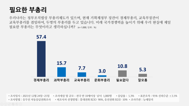 응답자 57.4% "경제부총리 가장 필요"이재명 후보가 '과학기술혁신 부총리제' 도입을 선언한 가운데, 같은 여론조사에서 '미래 국가경쟁력을 높이기 위해 우리 현실에 제일 필요한 부총리는 무엇인가'라는 물음에 응답자 57.4%는 '경제부총리'를 꼽았다. 이어 과학부총리 15.7%, 교육부총리 7.7%, 문화부총리 3.0%로 집계됐다. '필요 없다'는 10.8%, '잘 모름'은 5.3%다.현재 홍남기 기획재정부장관이 경제부총리를 유은혜 교육부장관이 사회부총리를 겸임하고 있다. 대권 도전을 선언한 김동연 전 경제부총리가 '교육부 폐지' 공약을 들고나온 가운데, 이재명 후보가 기초과학 분야에 집중 투자하겠다며 내건 과학부총리 신설도 여론의 호응을 얻는 것으로 보인다.