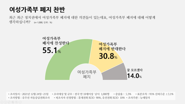 민주당·정의당 지지층 "여가부 폐지 반대" 우세한편, 여야 양강 대선후보들이 여성가족부(여가부) 폐지보단 명칭 변경을 통한 개편 및 업무 재조정을 주장한 가운데, 국민 대다수가 여가부 폐지에 찬성하는 것으로 나타났다.'여가부 폐지에 대해 어떻게 생각하는가'란 설문에 전체 응답자의 55.1%가 찬성한다고, 30.8%가 반대한다고 답했다. '잘 모름'은 14.0%로 조사됐다.연령별로 살펴보면 △만 18세~20대 찬성 66.5% 반대 25.9% △30대 찬성 67.5% 반대 24.6% △40대 찬성 66.0% 반대 24.8% △50대 찬성 48.0% 반대 35.9% △60대 찬성 44.0% 반대 37.0%로 집계됐다. 70세 이상만 찬성 34.6% 반대 37.9%로 유일하게 반대 의견이 높았다. 비교적 젊은 층에서 여가부 폐지 여론이 다수를 차지했다.성별로는 남성은 찬성 65.2% 반대 24.5%, 여성은 찬성 45.1% 반대 37.1%로 성별과 관계없이 찬성 응답이 우세했다.지지 정당별로는 더불어민주당·정의당 지지층에서 여가부 폐지 반대가 근소하게 앞섰다. △민주당 지지층은 찬성 42.3% 반대 44.2% △국민의힘 지지층 찬성 68.0% 반대 19.0% △정의당 지지층 찬성 37.8% 반대 41.4% △국민의당 지지층 찬성 58.3% 반대 30.3%다.대선 가상 4자대결에서 이재명 후보를 지지한다는 응답자 중 47.5%가 여가부 폐지에 찬성한다고 답해 정당 지지층과 의견이 갈렸다. 반대 의견은 38.7%고 '잘 모름'은 13.8%다.윤석열 후보 지지자 가운데에선 찬성 의견이 64.7%로 압도적으로 높았다. 반대는 21.3%고 '잘 모름'은 14.0%다.이번 조사는 유무선 자동응답 전화조사 방식으로 진행됐다. 휴대전화 RDD 90%, 유선전화 RDD 10% 비율로 피조사자를 선정했으며, 최종 응답률은 5.3%, 표본오차는 95% 신뢰수준에서 ±3.1%p다.조사완료 후 2021년 10월 행정안전부 주민등록인구를 기준으로 지역별, 성별, 연령별 가중값을 부여(림가중)했으며, 자세한 조사 개요와 결과는 중앙선거여론조사심의위원회 홈페이지를 참고하면 된다.