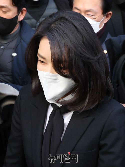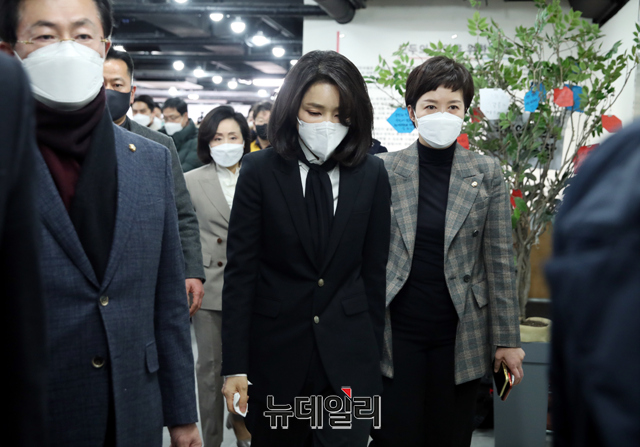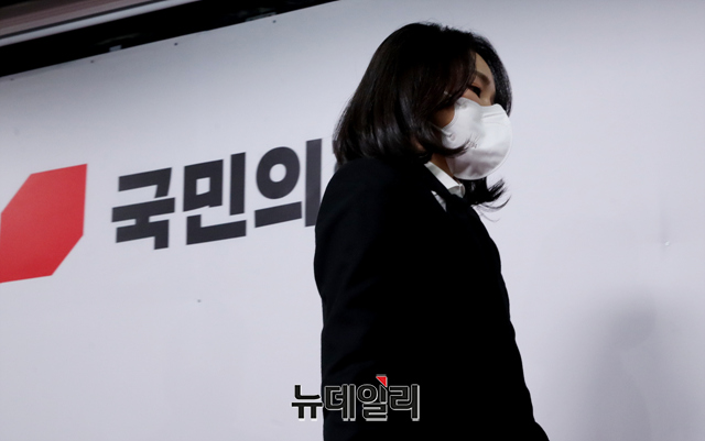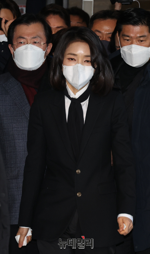 윤석열 국민의힘 대선 후보의 아내 김건희 씨가 26일 오후 서울 여의도 국민의힘 당사에서 허위경력 의혹과 관련해 입장문 발표를 마치고 당사를 나서고 있다.