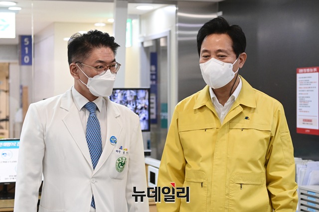 오세훈 서울시장이 27일 오전 서울 광진구 혜민병원을 방문해 병원 관계자로부터 코로나19 거점 전담병원 운영관련 설명을 듣고 있다.