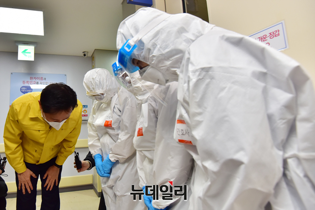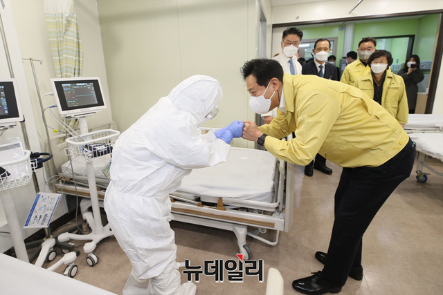 오세훈 서울시장이 27일 오전 서울 광진구 혜민병원을 방문해 의료종사자를 격려하고 있다.
