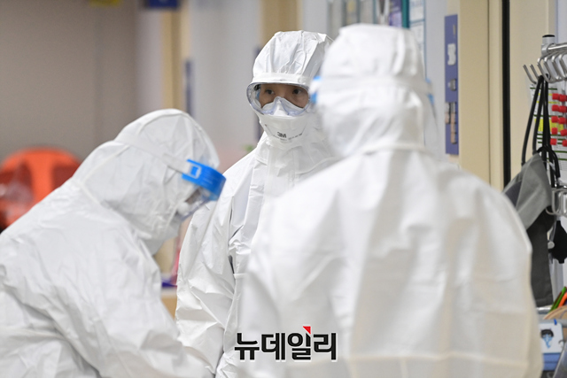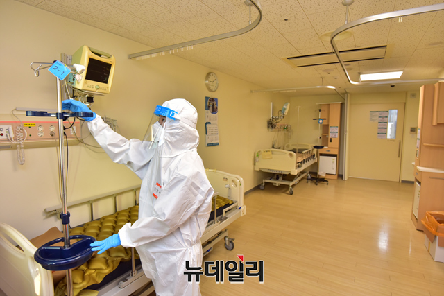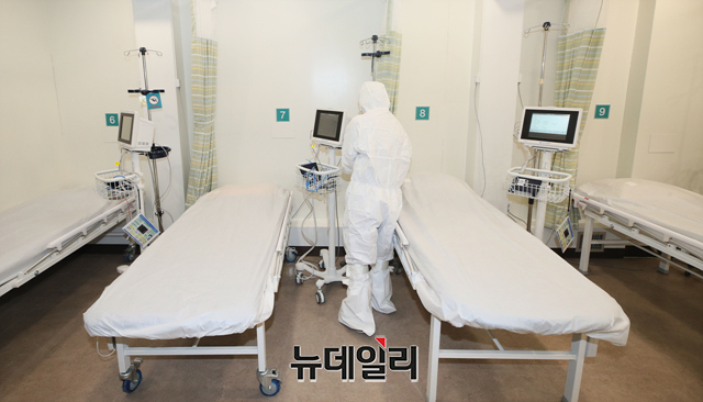 혜민병원이 코로나19 거점전담병원으로 지정된 27일 오전 의료진들이 응급환자 처치실에서 의료장비를 살펴보고 있다.