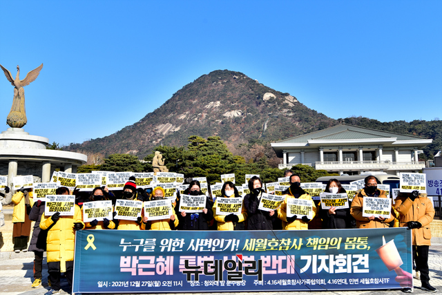 4.16세월호참사가족협의회·민변세월호참사 TF 등 시민단체가 27일 오전 서울 종로구 청와대 분수대 앞에서 박근혜 전 대통령의 특별사면을 반대하는 기자회견을 갖고 있다.