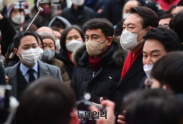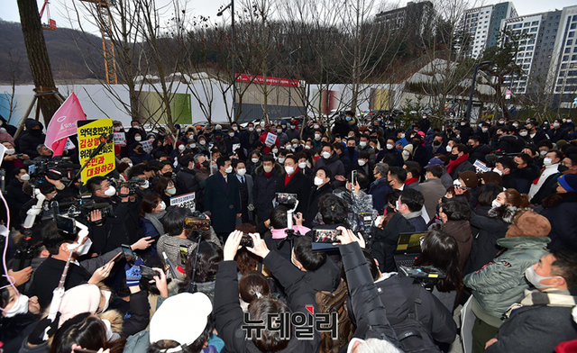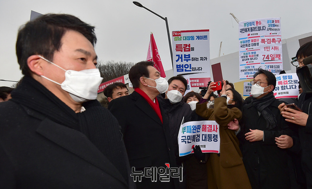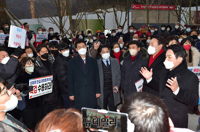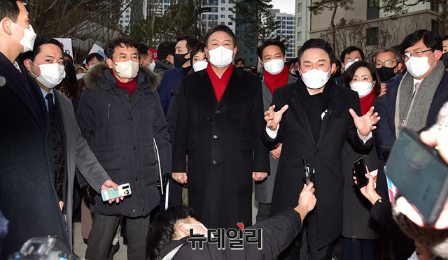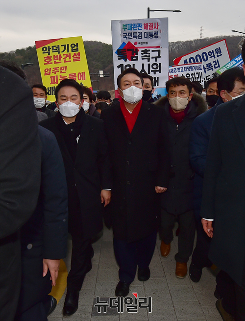 윤석열 국민의힘 대선후보가 27일 오후 경기 성남시 대장동을 방문해 현장을 둘러보고 있다. 현장에는 지지자들이 대거 몰려 대장동게이트 수사를 촉구했다. 또 윤 후보를 규탄하는 시민들은 본인, 부인, 장모를 수사하라는 손피켓을 들었다. (경기 성남=정상윤 기자)