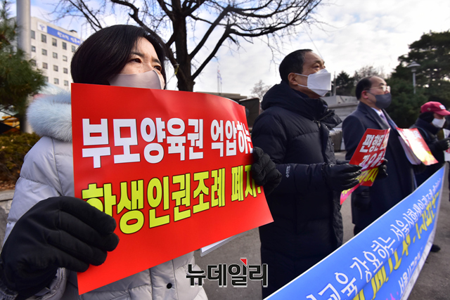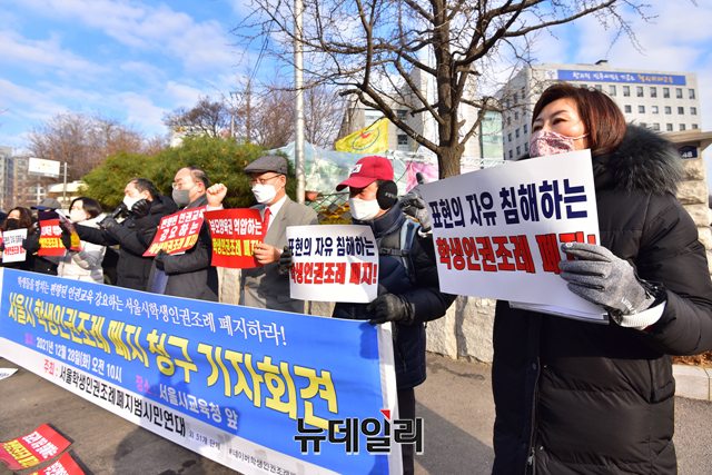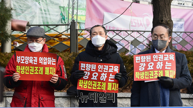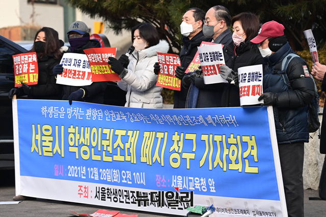 서울학생인권조례폐지범시민연대가 28일 오전 서울 종로구 서울시교육청 정문 앞에서 서울시교육청의 학생 인권조례 폐지를 청구하는 기자회견을 갖고 있다.이들은 "교육부가 동성애과 성전환 등을 옹호하고 조장하는 학생인권종합계획이 만들어질 수밖에 없다"며 "학생인권조례에 대한 폐지 없이는 근본적인 문제 해결을 할 수 없다"고 말했다.