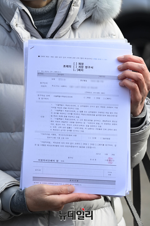 기자회견을 마치고 조례 폐지 청구서를 교육청에 제출했다. -