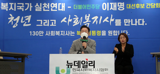 이재명 더불어민주당 대선후보가 28일 오전 서울 영등포구 문래동 한국사회복지사협회에서 열린 복지국가실천연대 간담회 '청년 그리고 사회복지사를 만나다'에서 참석자들의 질문에 답변하고 있다. (사진=공동취재단)