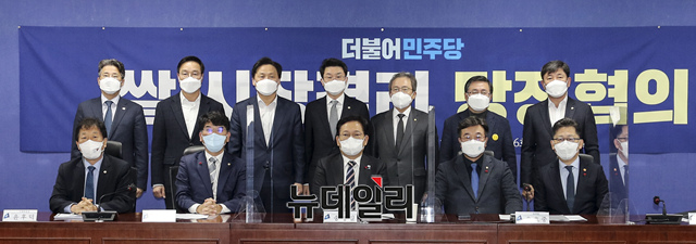 쌀 시장 격리 당정협의가 28일 오전 서울 여의도 국회 의원회관에서 열린 가운데 참석자들이 기념촬영을 하고 있다. (앞줄 왼쪽부터 윤후덕 의원, 박완주 정책위의장, 송영길 대표, 윤호중 원내대표, 김현수 농림축산식품부 장관) (사진=공동취재단)