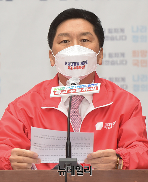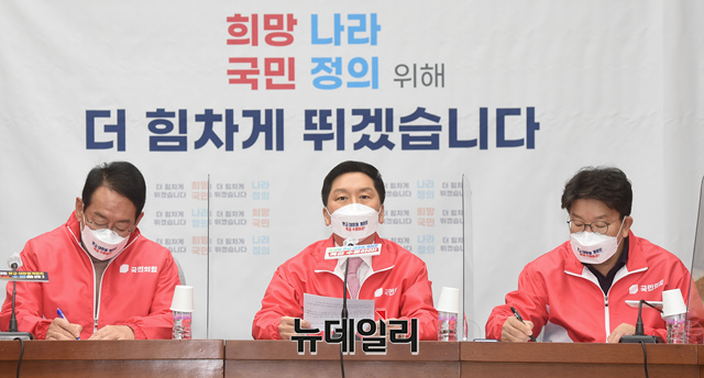 김기현 국민의힘 원내대표가 28일 오전 국회에서 열린 원내대책회의에 참석해 발언을 하고 있다. (사진=공동취재단)
