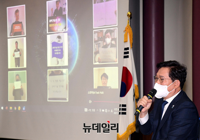 송영길 더불어민주당 대표가 29일 오전 국회에서 열린 이재명 후보를 지지하는 과학기술인 모임에 참석해 축사를 하고 있다. (사진=공동취재단)