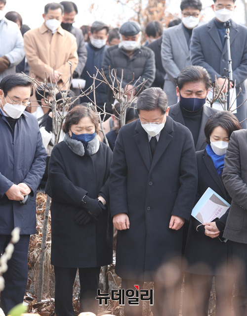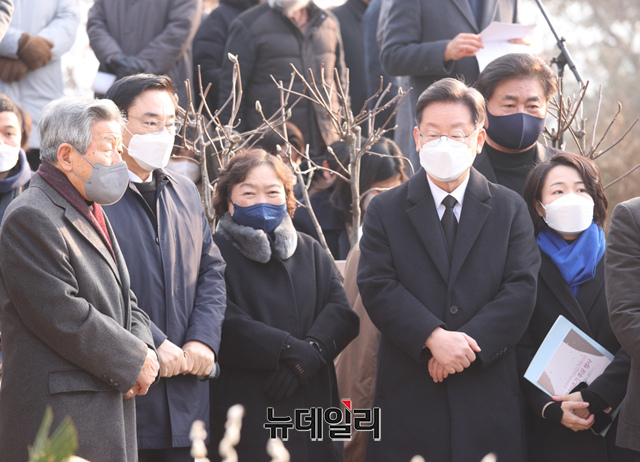 이재명 더불어민주당 대선후보가 29일 오전 경기 남양주시 마석 모란공원묘지에서 열린 고(故) 김근태 전 열린우리당 의장의 10주기 행사에서 추모사를 하고 있다. (사진=이재명 캠프)