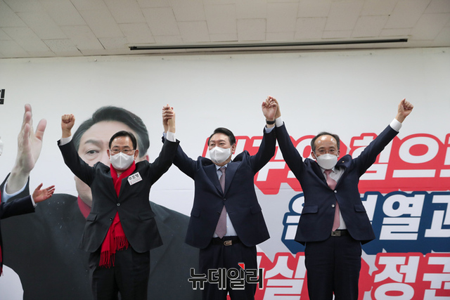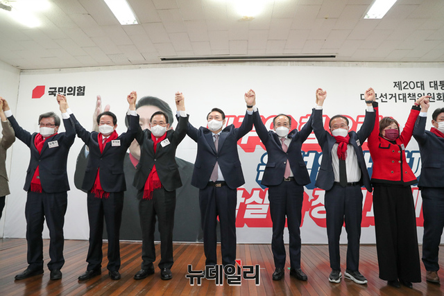 대구·경북지역을 방문중인 윤석열 국민의힘 대선후보가 30일 오전 대구 수성구 국민의힘 대구시당에설 열린 대구 선대위 출범식에서 기념촬영을 하고 있다. (사진=윤석열 캠프)