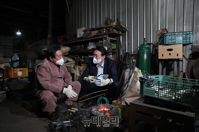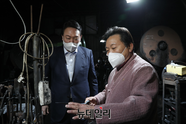 국민의힘 윤석열 대선 후보가 30일 경북 영주시 영주대장간을 방문해 호미 제작 장인 석노기 씨의 설명을 들고 호미를 제작하는 체험을 하고 있다. (사진=윤석열 캠프)