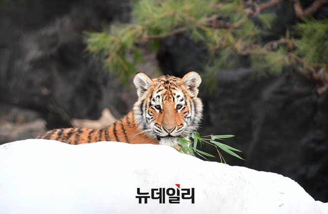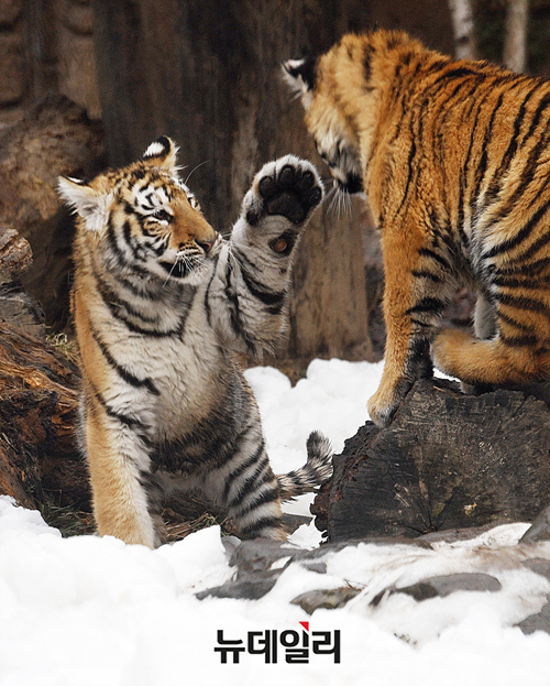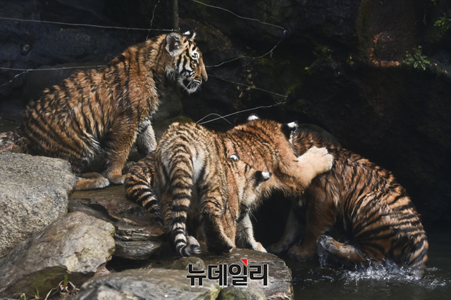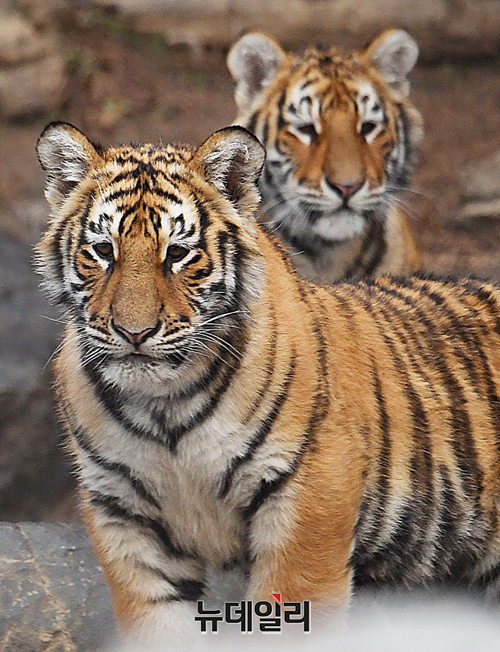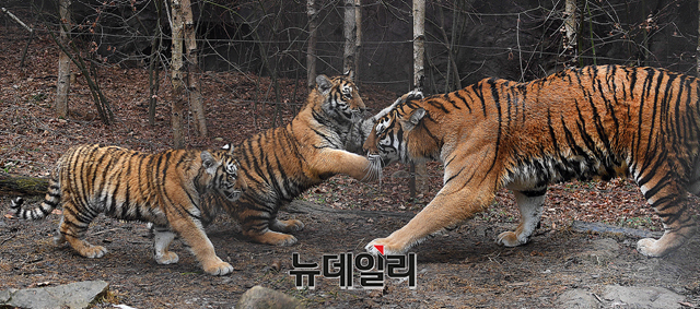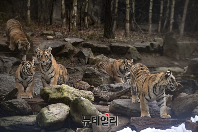 에버랜드가 다가오는 2022년 검은 호랑이 해(임인년)를 맞이해 21일 오전 경기 용인시 에버랜드 타이거밸리에서 엄마 호랑이 건곤이와 아름·다운·우리·나라·강산 이름을 가진 아기 호랑이들이 산책을 하고 있다.