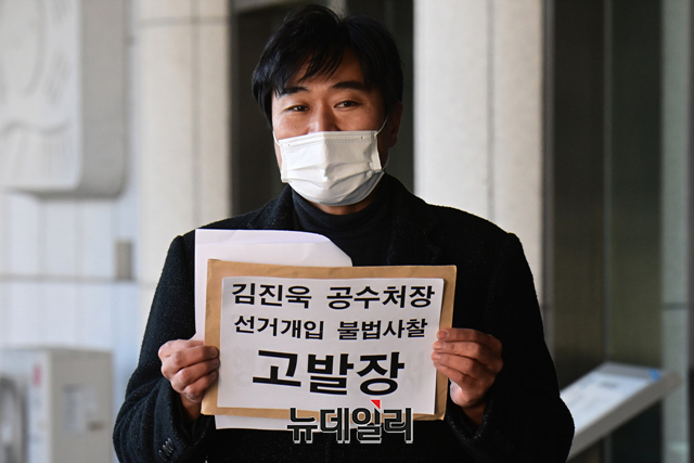 이종배 법치주의바로세우기행동연대 대표가 31일 오전 서울 서초구 대검찰청으로 김진욱 공수처장과 성명불상 공수처 수사관 등을 선거개입 불법사찰 위반 혐의로 고발했다.이 대표는 "공수처가 윤석열 국민의힘 대선후보를 포함한 가족들을 사찰해 김진욱 공수처장과 관계자를 고발 했다"며 "특정 대선후보를 낙선시킬 목적으로 사찰한 것으로 수사를 가장한 명백한 선거개입 불법사찰이다"고 말했다.