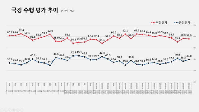文 국정수행 지지율 38.3%→39.89%로 다시 상승… 부정평가는 58.5% → 57.9% 소폭 감소4050 제외한 전 연령층서 "文 못한다" 60%대… 강원·제주서 긍정 19.2%↑, 부정 16.5%p↓"朴 사면은 국민통합, 적절" 51.7%가 文 지지… "보수분열, 부적절" 84.4%는 文 '부정평가'