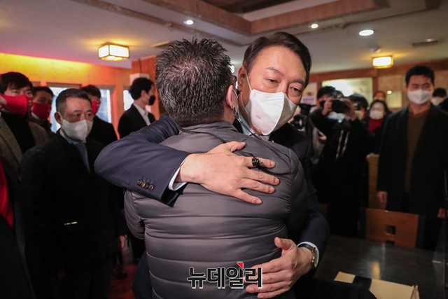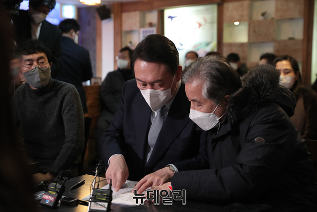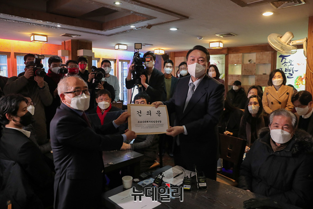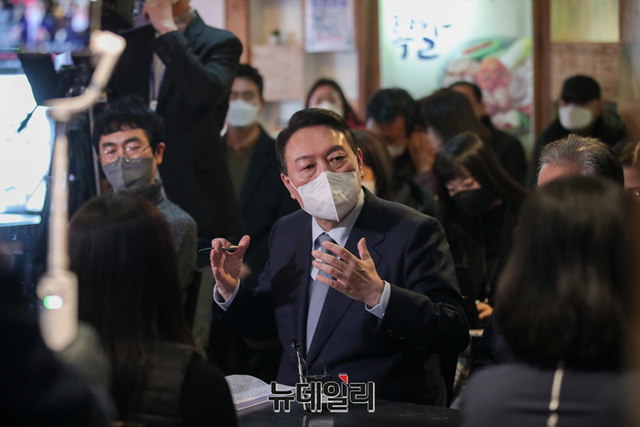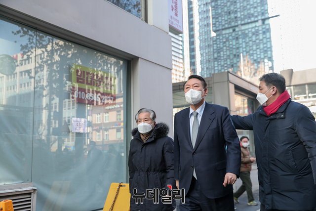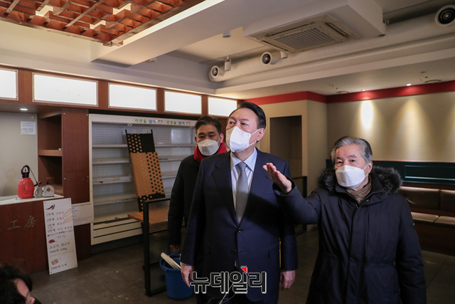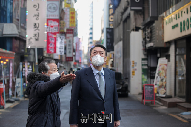 윤석열 국민의힘 대선후보가 2일 오후 서울 종로구 관철동에서 열린 자영업 피해 현장 간담회 참석해 현장을 둘러 보고 있다. (사진=윤석열 캠프)