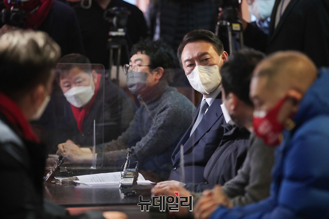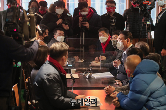 [포토] 자영업 피해 현장 간담회 참석한 윤석열 대선후보