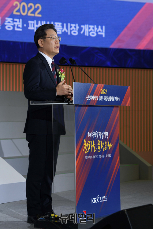 이재명 더불어민주당 대선 후보가 3일 오전 서울 여의도 한국거래소에서 열린 '2022 신년하례식 및 증권·파생상품시장 개장식'에서 개장축사를 하고 있다.