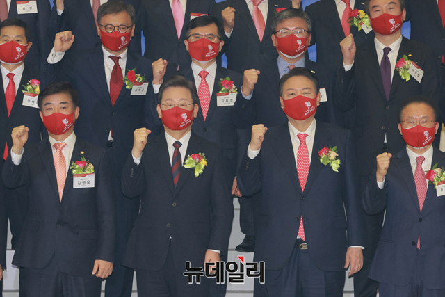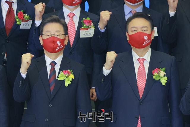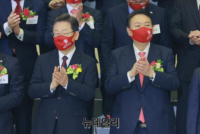 이재명 더불어민주당 대선 후보와 윤석열 국민의힘 대선 후보가 3일 오전 서울 여의도 한국거래소에서 열린 '2022 신년하례식 및 증권·파생상품시장 개장식'에서 손 악수를 나누고 있다.