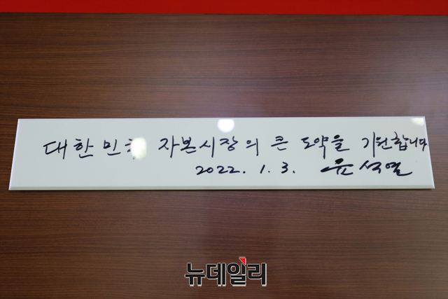 윤석열 국민의힘 대선 후보가 3일 오전 서울 여의도 한국거래소에서 열린 2022 신년하례식 및 증권·파생상품시장 개장식에서 "대한민국 자본시장의 큰 도약을 기원합니다"고 방명록을 작성하고 있다.