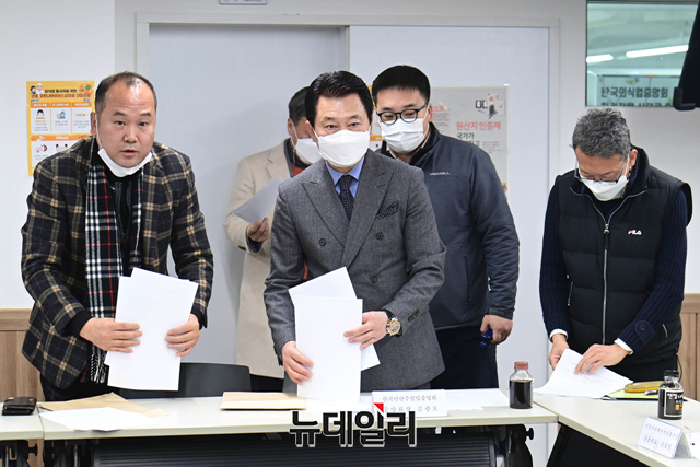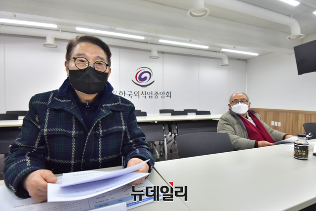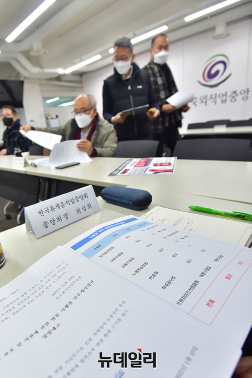 코로나피해자영업총연합(코자총)과 소속 자영업 단체 관계자들이 4일 오전 서울 중구 한국외식업중앙회 사무실에서 집단휴업을 결정하는 회의를 하고 있다. 결과는 오후에 나올 예정이다.