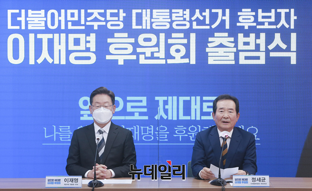 정세균 이재명후원회 후원회장이 4일 오후 서울 여의도 중앙당사에서 열린 이재명 대선후보 후원회 출범식에서 인사말을 하고 있다. (사진=공동취재단)