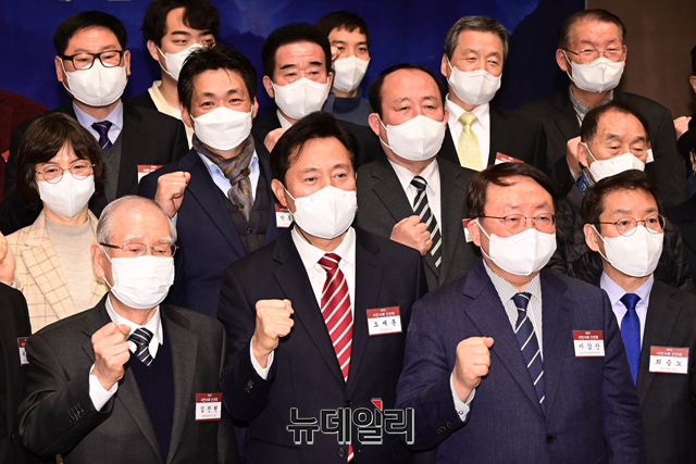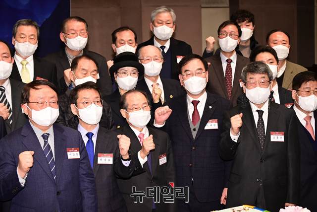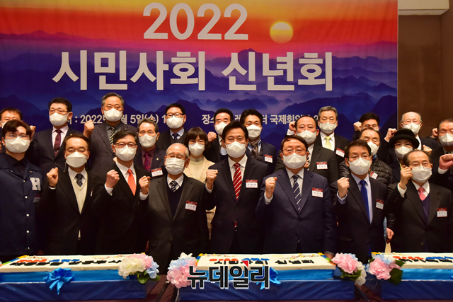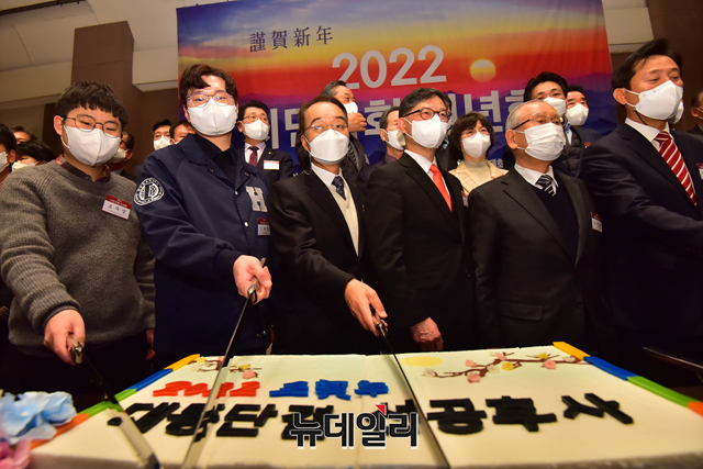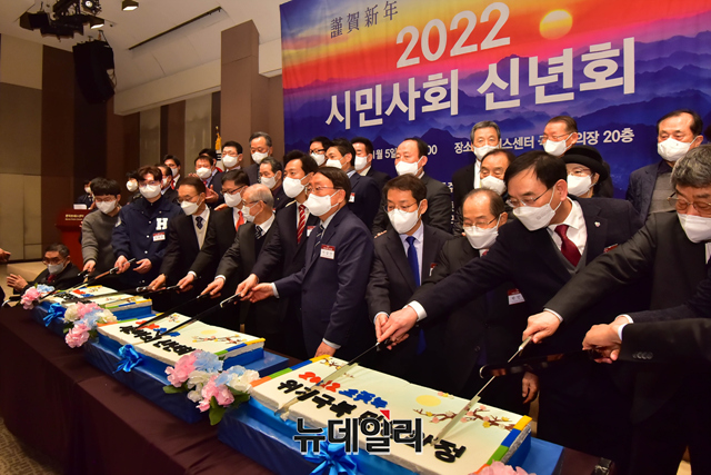 오세훈 서울시장, 이갑산 범시민사회단체연합 회장, 김진현 세계평화포럼 이사장을 비롯한 내빈들이 5일 오전 서울 중구 한국프레스센터에서 열린 2022 시민사회 신년회에서 떡커팅을 하고 있다.
