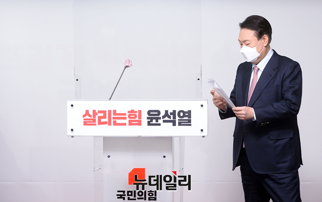 윤석열 국민의힘 대선 후보가 5일 오전 서울 여의도 중앙당사에서 선거대책위원회 쇄신 관련 입장발표를 하고 있다. (사진=공동취재단)