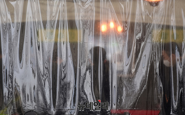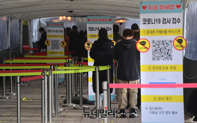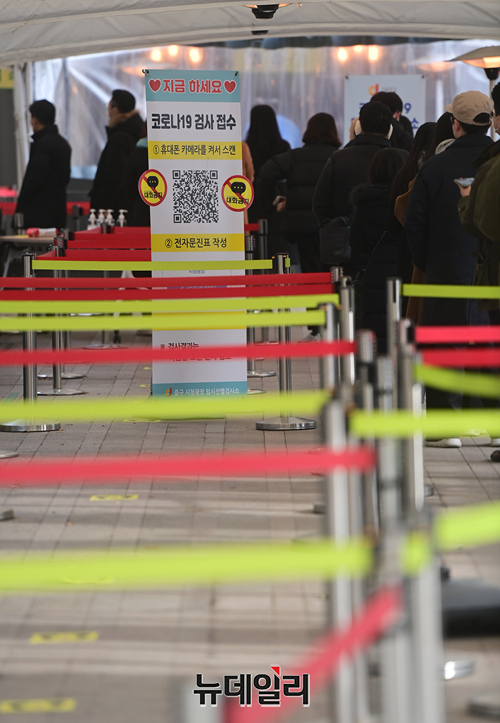 서울 중구 서울광장에 마련된 임시 선별진료소에 5일 오후 시민들이 PCR 검사를 받기 위해 줄을 서 있다. 임시선별소에는 날씨로 인해 비닐 장막이 설치됐다. 이날 신규 확진자는 4,444명이 발생했다.