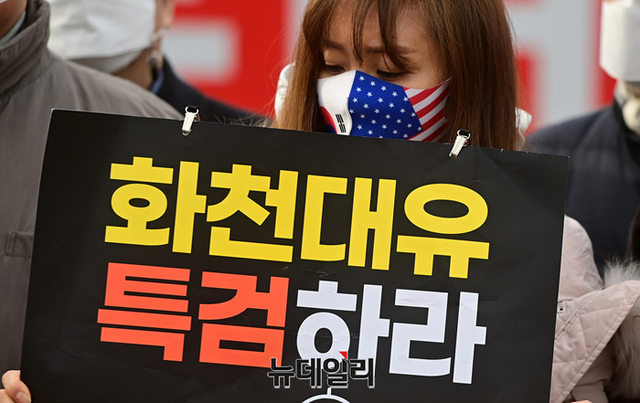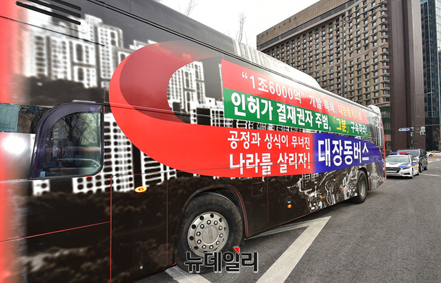 버스 외관에는 '인허가 결재권자 그분 구속하라' '공정과 상식이 무너진 나라를 살리자' 등의 문구가 새겨졌다.