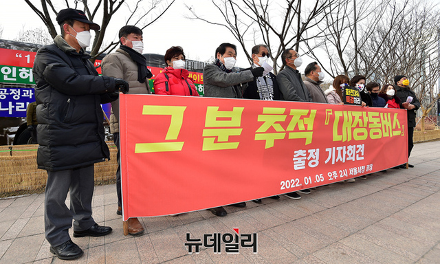 판교 대장동 비리의 진상규명을 촉구하는 시민단체가 5일 오후 서울 중구 서울광장에서 대장동버스 출정식을 갖고 있다.