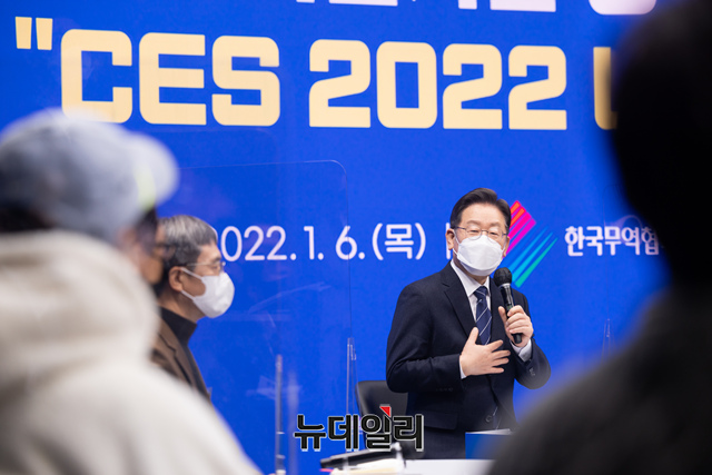 이재명 더불어민주당 대선후보가 6일 서울 강남구 코엑스 스튜디오 159에서 열린 "CES2022 LIVE" 혁신기업 정책간담회에 참석해 인사말을 하고 있다. (사진=이재명 캠프)