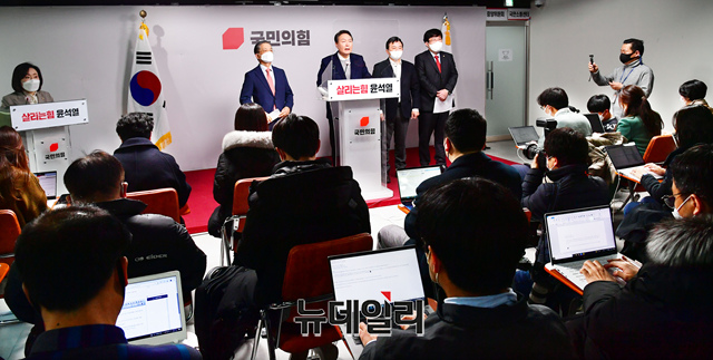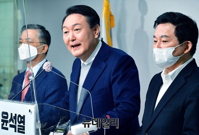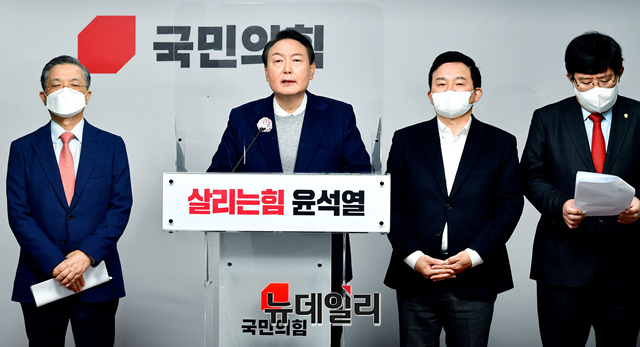 윤석열 국민의힘 대선후보가 6일 오전 서울 영등포구 여의도동 당사에서 '신도시 재정비' 정책공약을 발표하고 있다.