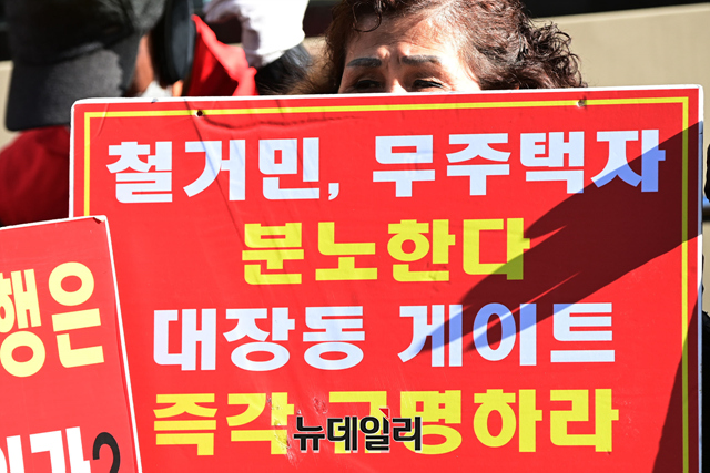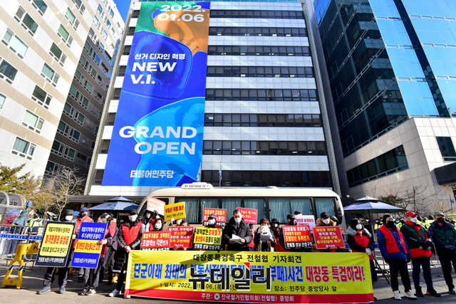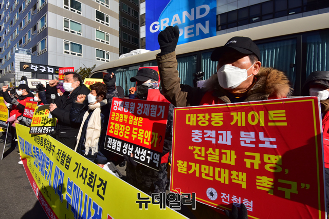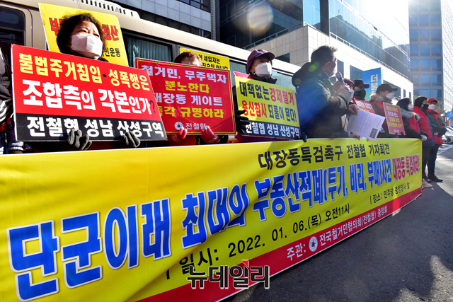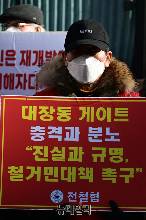 전국철거민협의회 중앙회(전철협)가 6일 오전 서울 여의도 더불어민주당 당사 앞에서 대장동특검을 촉구하는 기자회견을 갖고 있다.