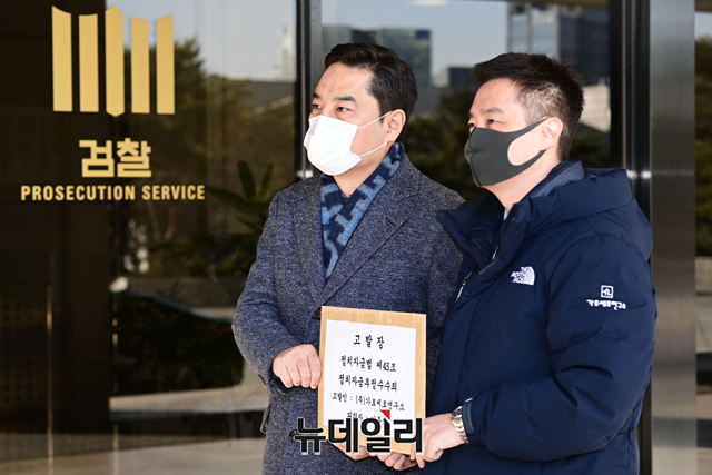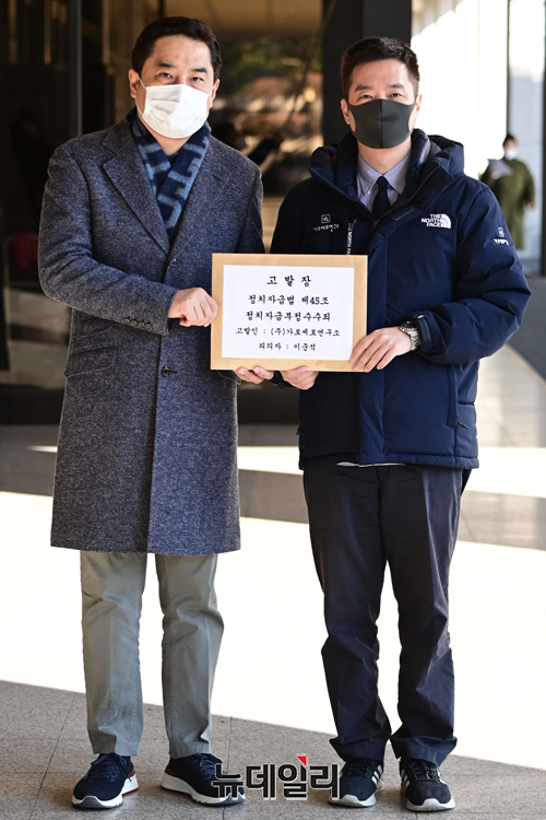 가로세로연구소 강용석 소장과 김세의 대표가 6일 오후 서울 서초구 중앙지검으로 이준석 국민의힘 대표를 정치자금법 제45조(정치자금부정수수죄) 위반 등의 혐의로 고발하고 있다.