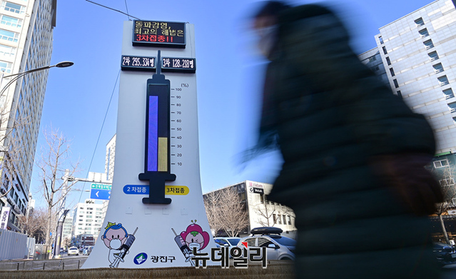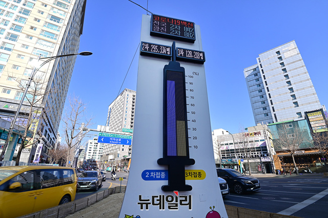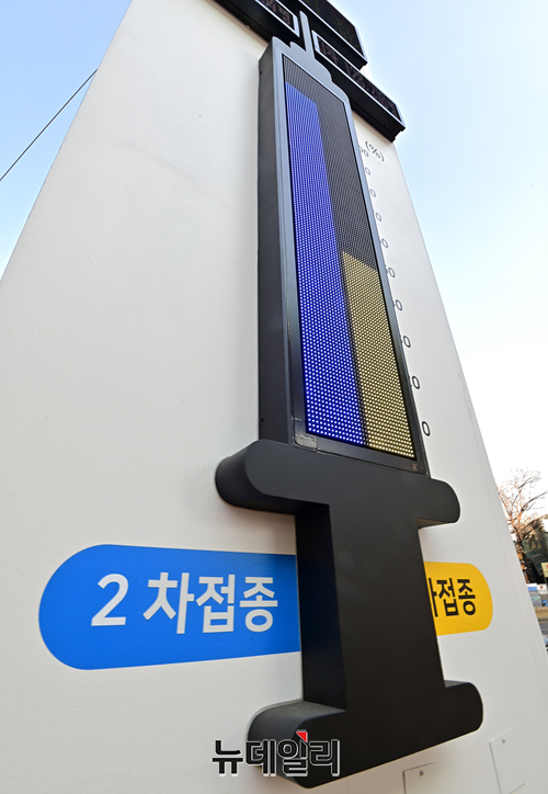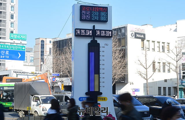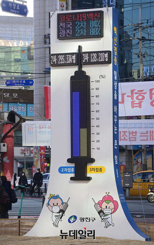 코로나19 백신 접종률을 나타내는 접종률 온도탑이 7일 오후 서울 광진구 자양사거리에 설치 돼 있다. 7일 현재 전국 백신접종은 접종완료 83.4%, 추가접종은 39.1%다.