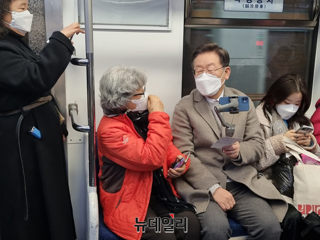 이재명 더불어민주당 대선후보가 7일 오후 지하철로 이동하며 시민들과 대화를 나누고 있다. (사진=이재명 캠프)