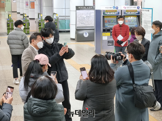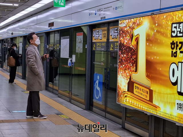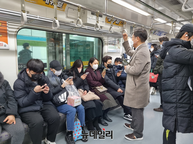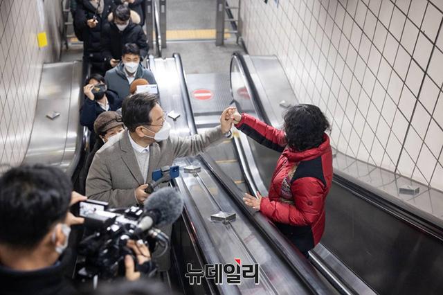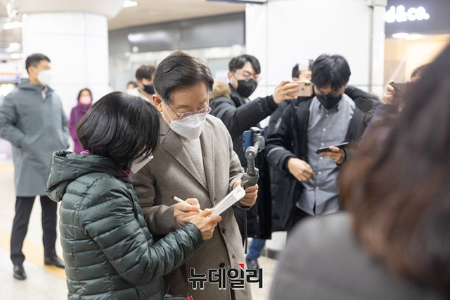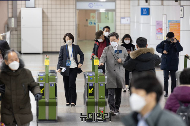 [포토] 지하철로 이동하며 시민들 만나는 이재명