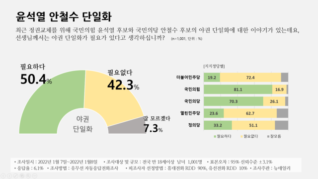 윤석열 국민의힘 대선 후보와 보수 야권 후보인 안철수 국민의당 대선 후보의 단일화를 묻는 질문에 단일화가 필요하다는 답이 절반 이상을 차지한 것으로 나타났다. 더불어민주당 지지자들은 72.4%가 단일화가 필요없다고 응답했지만, 국민의힘·국민의당 지지자들은 각각 81.1%와 70.3%가 단일화가 필요하다고 답한 것으로 집계됐다.종전선언에 대한 의견을 묻는 질문엔 찬반이 각각 43.0%와 41.7%로 격차는 1.3%p에 불과했다.가상 삼자·사자대결서 尹·安 지지자 모두 "단일화 필요" 우세뉴데일리 의뢰로 여론조사업체 피플네트웍스리처치(PNR)가 지난 7~8일 이틀간 전국 성인남녀 1001명을 대상으로 '윤석열-안철수 단일화'를 조사한 결과 '필요하다'는 응답은 50.4%, '필요없다'는 응답은 42.3%로 집계됐다. '잘모름'이라고 답한 응답자는 7.3%였다.지지정당별로는 민주당 지지자의 19.2%는 필요하다고 답한 반면, 72.4%는 필요없다고 했다. 반면 국민의힘 지지자는 81.1%가 단일화가 필요하다고 했고, 16.9%는 필요없다고 했다. 국민의당 지지자들 가운데서는 70.3%가 단일화가 필요하다고 봤고, 26.1%는 필요없다고 응답했다.가상 사자대결에서 '이재명 지지자'라고 답한 응답자 가운데 74.8%는 단일화가 필요없다고 했고, 15.5%는 단일화가 필요하다고 했다.'윤석열 지지자'라는 응답자 중에서는 단일화가 필요하다는 응답이 82.1%, 필요없다는 응답이 14.4%를 차지했다. '안철수 지지자' 중에서도 단일화가 필요하다는 응답은 70.8%, 필요없다는 응답은 26.7%로 집계됐다.이재명 후보가 당선될 것으로 예상한 응답자 중에서는 26.6%가 단일화가 필요하다고 했고, 64.1%는 단일화가 필요없다고 했다. 윤석열 예상자 중 필요하다는 응답은 82.3%, 필요없다는 응답은 16.0%였다. '안철수 당선 예상'이라고 한 응답자 중 73.7%가 단일화가 필요하다고 답했다. 26.3%는 단일화가 필요없다고 했다.이재명-윤석열-안철수 가상 삼자 대결에서도 이재명 지지자들 사이에서는 단일화가 필요없다(72.7%)이 단일화가 필요하다(16.8%)는 응답보다 높게 나왔다. 윤석열 지지자들은 필요하다 82.3%, 필요없다 14.5%였다. 안철수 지지자들의 경우 필요하다 72.2%, 필요없다 25.4%로 나타났다.