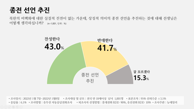 종전선언 찬성 43.0% vs 반대 41.7%… 오차범위 1.3%p종전 선언에 대해서는 찬성과 반대 격차가 오차범위 내인 1.3%p에 그쳤다. 찬성한다는 응답은 43.0%, 반대한다는 응답은 41.7%였다. 나머지 15.3%는 '잘모름'을 택했다.지역별로는 호남에서 종전선언에 찬성한다는 응답자가 제일 많이 나왔다. 호남에선 50.9%가 찬성했고 이어 서울 48.0%, 경기·인천 43.3%, 부산·울산·경남 42.2%, 대전·세종·충청 41.5%, 강원·제주 38.4%, 대구·경북 29.3% 등의 순이었다.종전선언에 반대한다는 응답률은 대구·경북이 55.6%로 가장 높았다. 그 뒤로는 대전·세종·충청(49.5%), 강원·제주(46.4%), 부산·울산·경남(43.0%), 경기·인천(40.2%), 서울(38.3%), 호남(26.4%) 등이다.성별로 살펴보면 남성의 44.2%가 종전선언에 찬성했고, 46.0%가 반대했다. 여성은 41.8%가 찬성, 37.5%가 반대한 것으로 조사됐다.40~50대 제외하곤 종전선언 반대 더 많아연령별로는 40~50대에서만 종전선언에 찬성한다는 응답이 더 많았다. 40대는 52.0%가 종전선언에 찬성한 반면, 38.6%가 반대했다. 50대는 50.6%가 찬성, 35.2%가 반대했다.만18세~20대의 경우 찬성한다는 응답이 38.7%, 반대한다는 응답이 45.1%를 차지했다. 30대는 찬성 44.6%, 반대 45.1%였고, 60대는 찬성 34.9% 반대 50.7%였다. 70세 이상에서는 찬성한다는 응답이 32.8%, 반대한다는 응답이 36.3%였고 '잘 모르겠다'는 응답도 30.9%를 차지했다.지지정당별로는 민주당 지지자의 경우 74.4%가 종전선언에 찬성, 12.8%가 반대했지만 국민의힘 지지자들 사이에선 찬성한다는 응답이 14.8%, 반대한다는 응답이 72.8%로 조사됐다.국정수행평가 별로는 긍정평가한 응답자의 75.2%가 종전선언에 찬성했고, 10.9%가 반대했다. 부정평가한 응답자들은 19.2%가 찬성한 반면 65.9%가 반대했다.이번 조사는 뉴데일리 의뢰로 PNR 리서치가 1월 7일부터 8일까지 이틀 동안, 전국 만 18세 이상 남녀 1001 명을 대상으로 유·무선 자동응답 전화조사 방식으로 진행됐다. 휴대전화 RDD 90%, 유선전화 RDD 10% 비율로 피조사자를 선정하였으며, 최종 응답률은 6.1%, 표본오차는 95% 신뢰수준에서 ±3.1%p다. 자세한 조사 개요와 결과는 중앙선거여론조사심의위원회 홈페이지를 참고하면 된다.