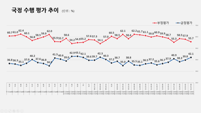 文대통령 국정수행 지지율 1.3%p 상승… 부정평가 2.2%p 감소4050 제외한 전 연령층 절반 이상 "국정수행 제대로 못한다"'남성' 긍정 41.6%, 부정 56.8%… '여성' 긍정 42.5%, 부정 54.6%