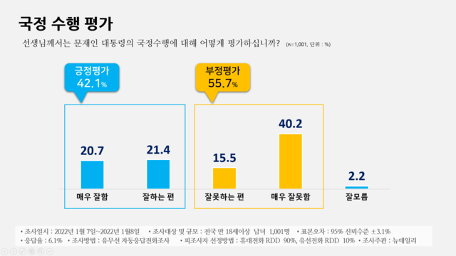 문재인 대통령의 국정수행 지지율이 지난주 대비 소폭 상승하며 다시 40%대에 진입했다. 다만 40대와 50대를 제외한 모든 연령대에서 문 대통령의 국정수행을 부정적으로 평가하는 응답이 절반을 넘어선 것으로 나타났다."文 잘한다" 상승, "못한다" 하락… 긍정 42.1%, 부정 55.7%뉴데일리 의뢰로 여론조사업체 피플네트웍스리처치(PNR)가 지난 7~8일 이틀간 전국 성인남녀 1001명을 대상으로 문 대통령의 국정수행 지지도를 조사한 결과 "긍정평가"는 42.1%로 지난 조사(39.8%)보다 1.3%p 올랐다. '매우 잘함'은 20.7%, '잘하는 편'은 21.4%였다."부정 평가"는 지난 조사(57.9%)보다 2.2%p 떨어진 55.7%로 집계됐다. '매우 잘못함'은 40.2%, '못하는 편'은 15.5%였다.지역별로 살펴보면, 호남(광주·전라) 지역에서는 69.3%(4.8%p↑)가 긍정 평가했다. 다음으로 서울 45.1%(3.7%p↑), 강원·제주 43.1%(13.3%p↓), 경기·인천 41.5%(3.0%p↑), 대전·충청·세종 39.7%(6.4%p↑), 부산·울산·경남 31.9%(4.5%p↓), 대구·경북 28.8%(7.5%p↑) 순으로 긍정 평가가 나왔다.반면 대구·경북에서는 68.1%(8.5%p↓)가 부정적 평가를 내렸다. 이어 부산·울산·경남 66.5%(6.3%p↑), 대전·세종·충청 57.3%(8.5%p↓), 경기·인천 56.8%(2.8%p↓), 강원·제주 55.0%(11.1%p↑), 서울 51.7%(4.5%p↓), 광주·전라 29.4%(4.1%p↓) 순으로 부정 평가가 나왔다.4050 제외한 전 연령층서 文 부정평가 50% 이상연령대별로 살펴보면, 40대와 50대를 제외한 모든 연령층에서 절반 이상이 문 대통령의 국정수행을 부정적으로 평가했다.만 18세~20대에서는 문 대통령의 국정수행을 긍정평가한 응답이 31.5%(1.0%p↓)로 나타난 반면 부정평가는 63.0%(3.3%p↓)로 조사됐다. 30대는 긍정 41.7%(7.7%p↑), 부정 57.0%(8.1%p↓)였다. 60대는 긍정 36.8%(1.8%p↑), 부정 60.4%(2.6%p↓)였고 70대 이상은 긍정 37.0%(3.0%↑), 부정 61.4%(2.2%p↓)로 집계됐다.반면 40대와 50대에서는 긍정평가가 부정평가보다 높게 나타났다. 40대는 긍정 50.4%(2.8%p↑), 부정 48.4%(0.8%p↑) 였고, 50대는 긍정 51.7%(0.3%p↑), 부정 47.3%(0.8%p↑)였다.성별로는 남녀 모두 문 대통령의 국정수행을 부정적으로 본다는 응답이 높게 나타났다. 남성의 경우 긍정 41.6%(2.1%p↑), 부정 56.8%(1.7%p↓)였고, 여성은 긍정 42.5%(2.3%p↓), 부정 54.6%(2.7%p↓)로 조사됐다."종전선언 찬성" 73.6%가 文 지지… "종전선언 반대" 88.0%는 부정평가더불어민주당 지지자는 86.3%가 문 대통령의 국정수행을 긍정적으로 봤다. 부정평가는 12.6%에 그쳤다. 반면 국민의힘 지지자는 4.9%가 긍정평가했고, 93.1%는 부정평가했다.또 내년 대선에서 현재 지지하는 후보를 '계속 지지하겠다'는 응답자 가운데서는 45.1%가 문 대통령의 국정수행을 긍정평가했다. 반면 53.1%는 부정평가했다. '지지 후보를 바꿀 수다 있다'는 응답자 가운데 33.4%는 문 대통령 국정수행을 긍정적으로 봤고, 63.7%는 부정적으로 봤다.가상 4자 대결에서 '이재명 지지자'라고 응답한 사람 가운데 87.3%는 문 대통령 국정수행을 긍정평가했고, 10.5%는 부정평가했다. '윤석열 지지자' 가운데서는 4.4%가 긍정평가를, 94.2%가 부정평가를 내놨다.야권단일화가 필요하다는 응답자 가운데 17.0%는 문 대통령 국정수행을 긍정평가했고, 81.3%는 부정평가했다. 야권단일화가 필요없다고 응답한 사람 가운데 69.6%는 긍정평가, 28.6%는 부정평가했다.종전선언에 찬성한다는 응답자의 73.6%는 문 대통령 국정수행에 대해 긍정적으로 평가했고, 24.8%는 부정적으로 평가했다. 종전선언에 반대한다는 응답자 중 11.0%는 긍정평가를, 88.0%는 부정적 평가를 내렸다.이번 조사는 뉴데일리 의뢰로 PNR 리서치가 1월 7일부터 8일까지 이틀 동안, 전국 만 18세 이상 남녀 1001 명을 대상으로 유·무선 자동응답 전화조사 방식으로 진행됐다. 휴대전화 RDD 90%, 유선전화 RDD 10% 비율로 피조사자를 선정하였으며, 최종 응답률은 6.1%, 표본오차는 95% 신뢰수준에서 ±3.1%p다. 자세한 조사 개요와 결과는 중앙선거여론조사심의위원회 홈페이지를 참고하면 된다.