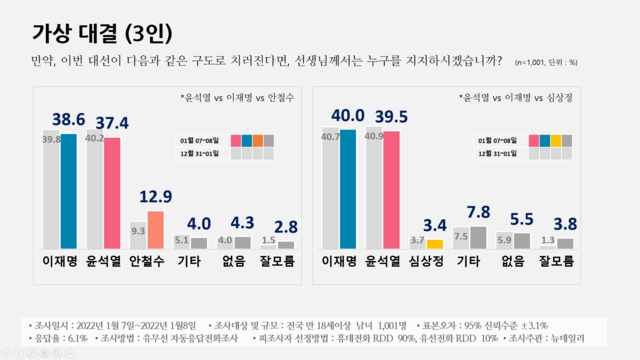 '가상 삼자대결' 李 38.6%, 尹 37.4%, 安 12.9%‥ 李 40.0%, 尹 39.5%, 沈 3.4%與野 주자, 安 대결 때 격차 벌어져… 尹, 20대 우세 VS 李, 수도권·4050 높아